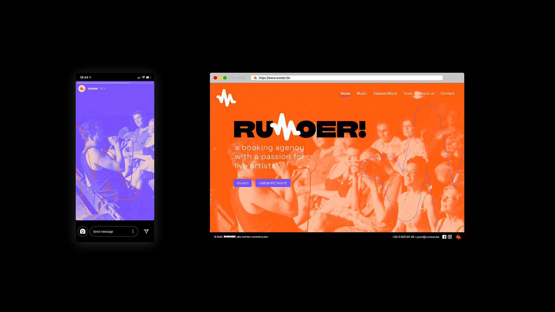 Logo design, branding, webdesign and motion design for the Rumoer!, a booking agency from Antwerp.